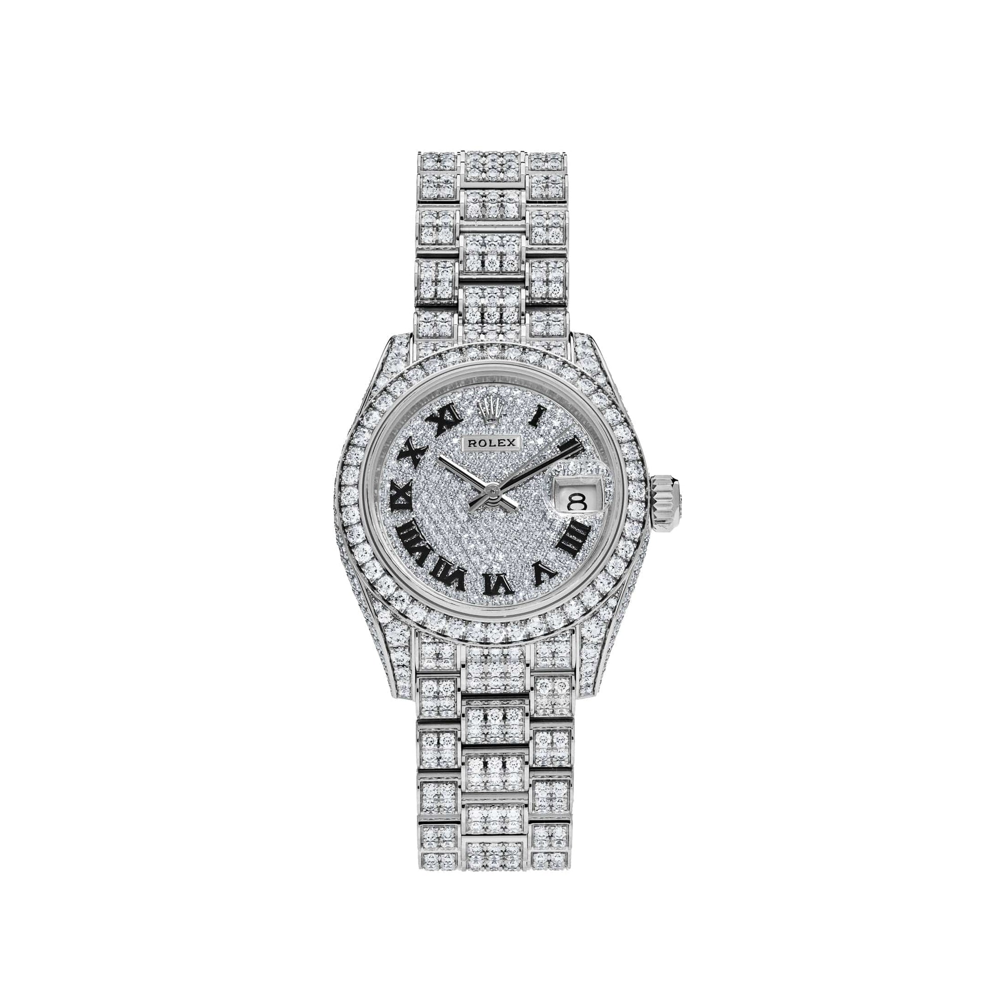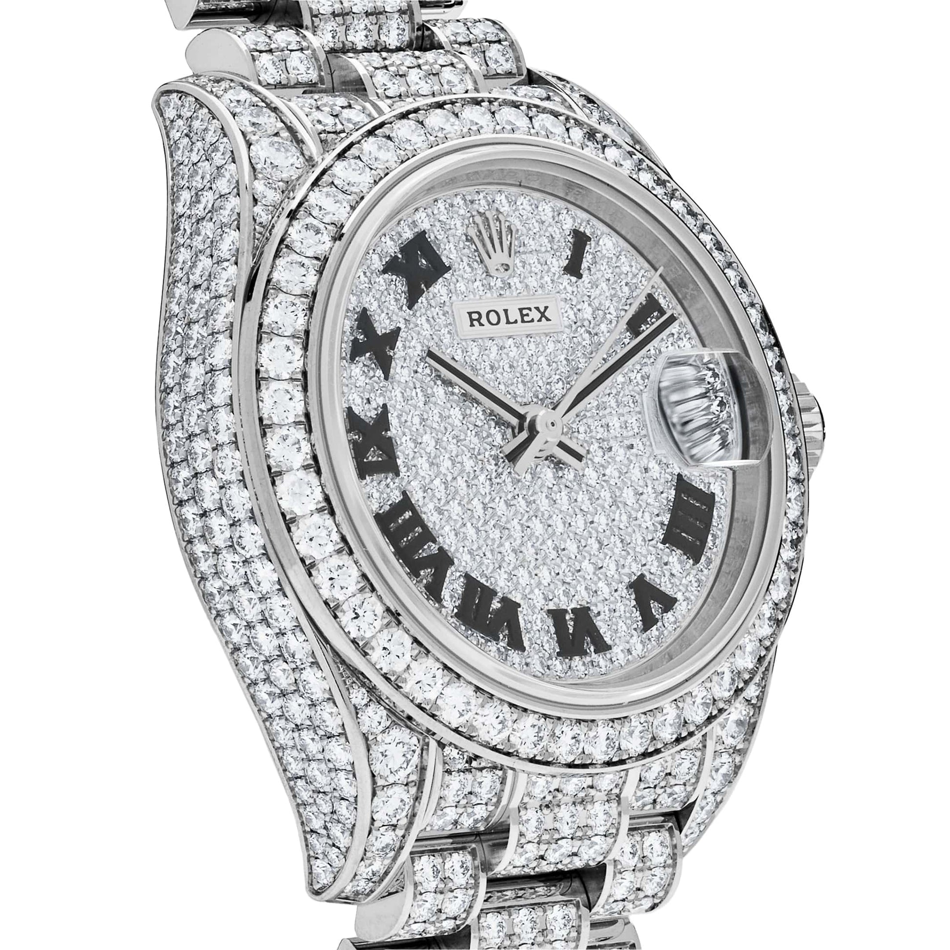 This Ladies Datejust is crafted in a white gold case measuring 28mm with the case sides and lugs set with diamonds. The bezel. set with 44 brilliant-cut diamonds. surrounds a diamond-paved dial. set with 291 diamonds. and black roman numeral hour markers. The president bracelet is crafted in white gold set with 596 brilliant-cut diamonds. finished with a concealed folding crownclasp.